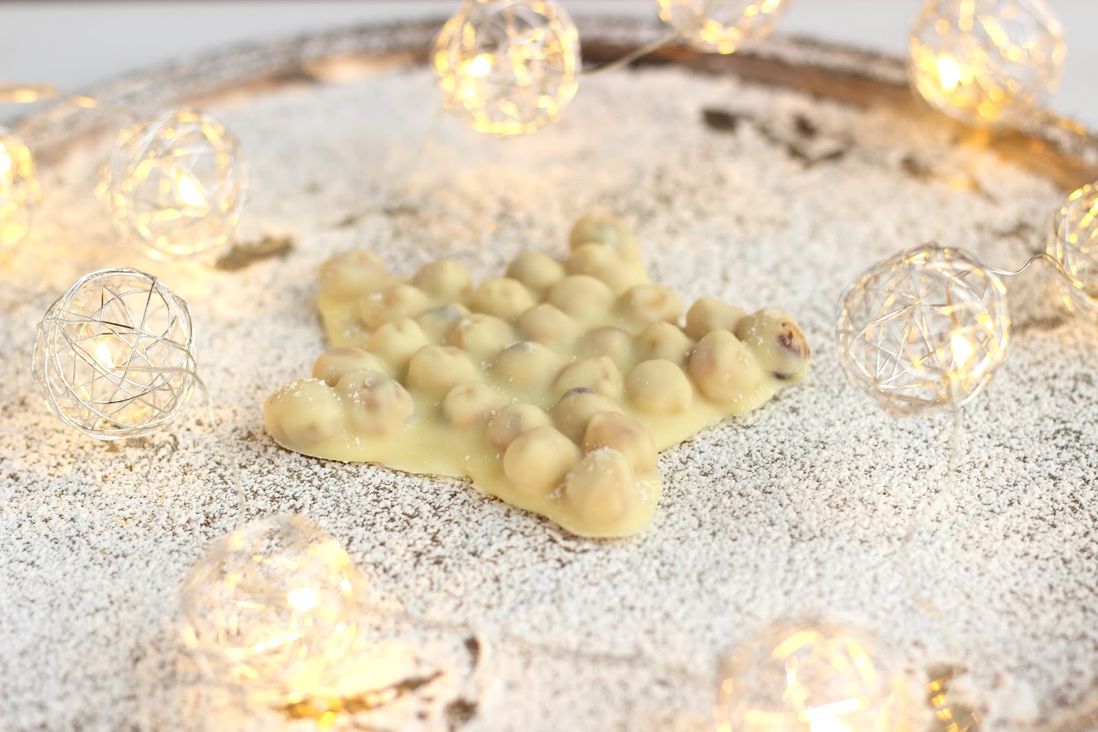 All you need is 3-4 white chocolates (100g each) and some hazelnuts. I roasted them on a frying pan for 5 min. and then peeled the skin off. But you can buy blanched hazelnuts which will make everything so much quicker. Melt the chocolate over bain marie and add hazelnuts. Now you have to try and make something resembling the star shape with your chocolate covered hazelnuts. Drawing a 3 different sizes of star shape on parchment paper will be very helpful. Wait until it is set and arrange as you wish.